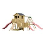 Drewniany domek Hubert z dwoma ślizgami podwójną huśtawką z platformą i ślizgiem oraz ścianką wspinaczkową